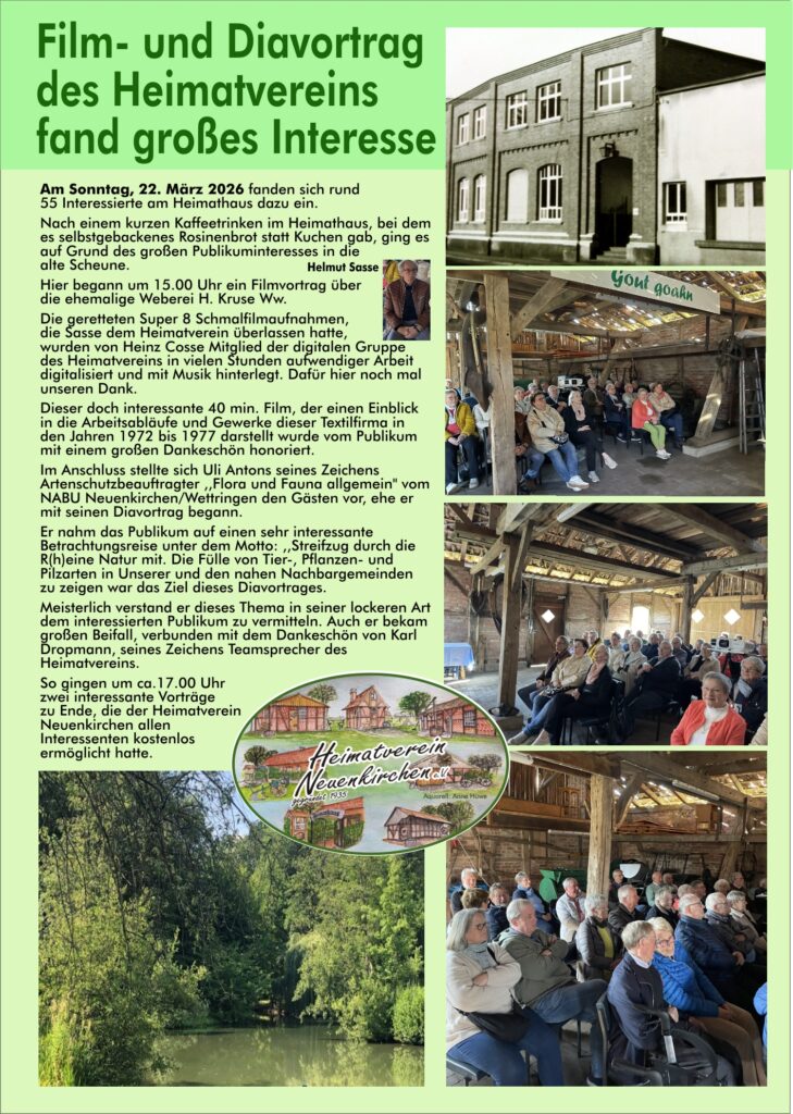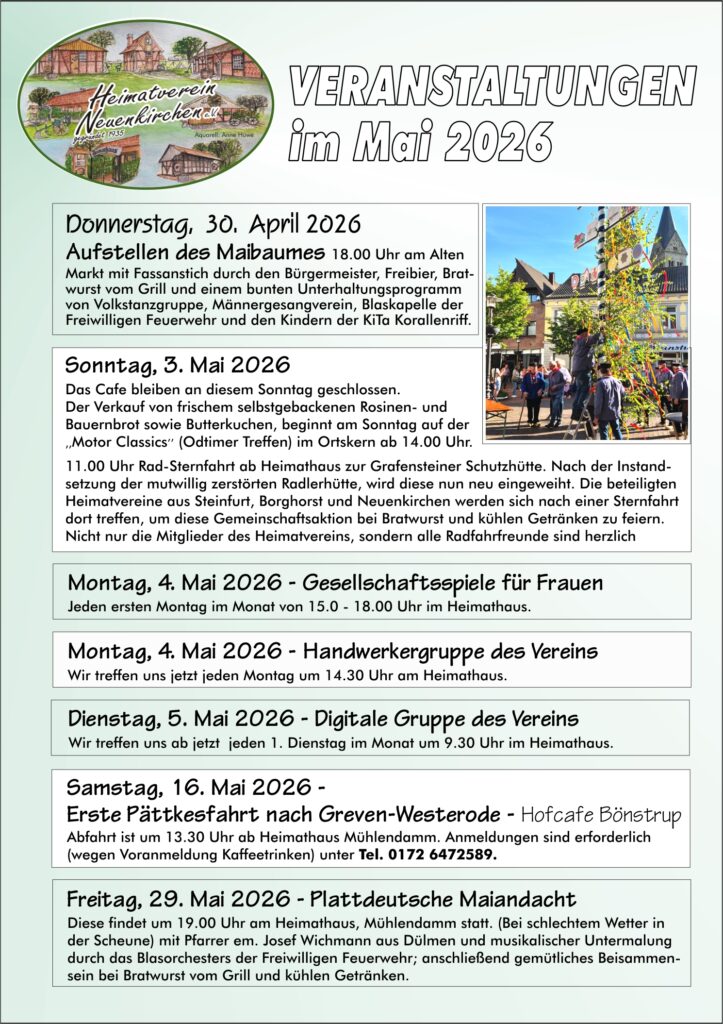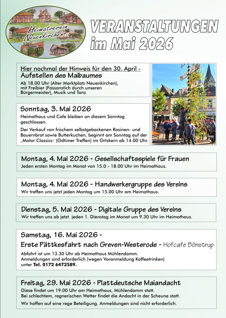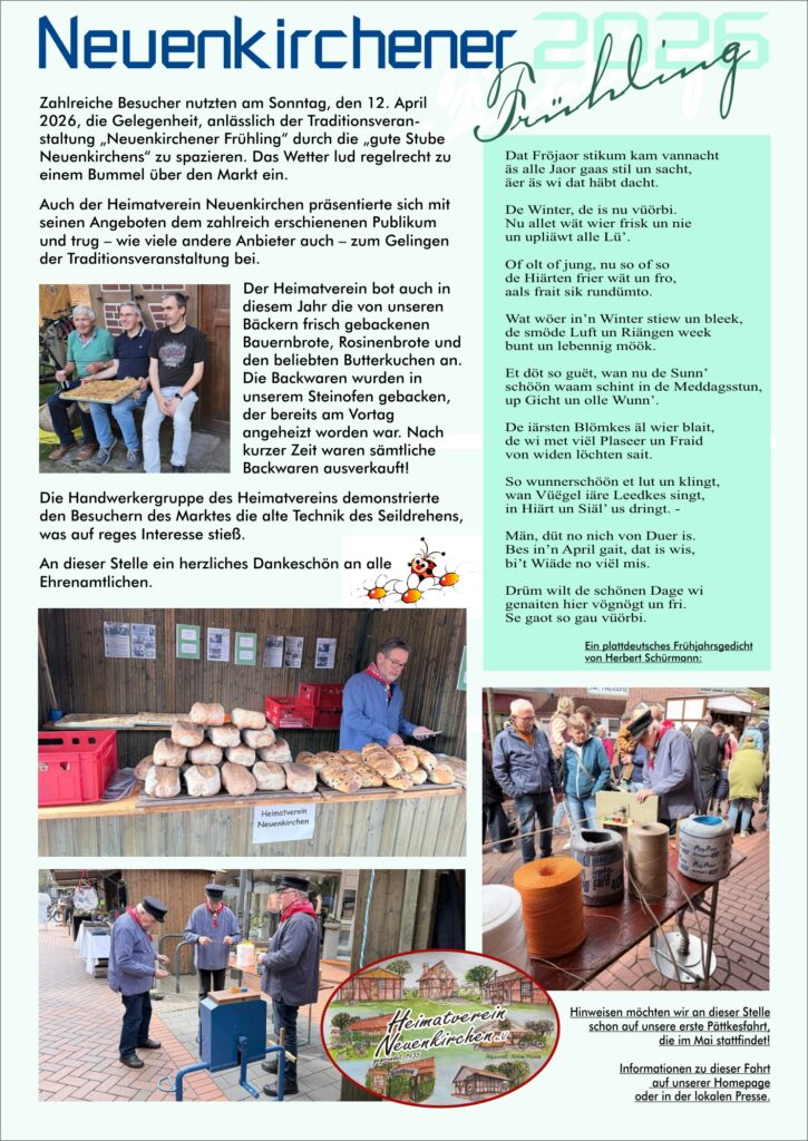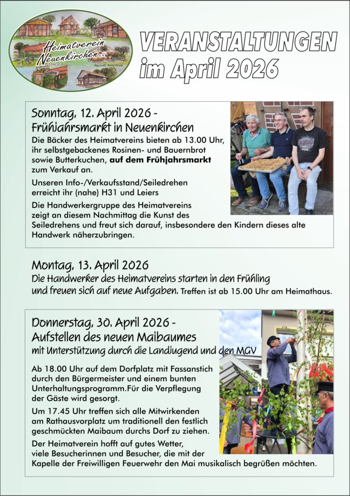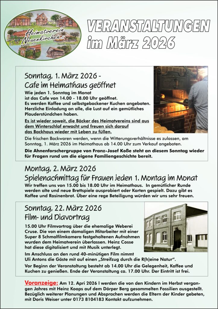 Treffen der Handwerkergruppe, des Arbeitskreises Familienforschung, das Kartenspielen der Frauen sowie Brotbacktage und Cafe am Sonntag, sind bei uns regelmäßige Monatsveranstaltungen.