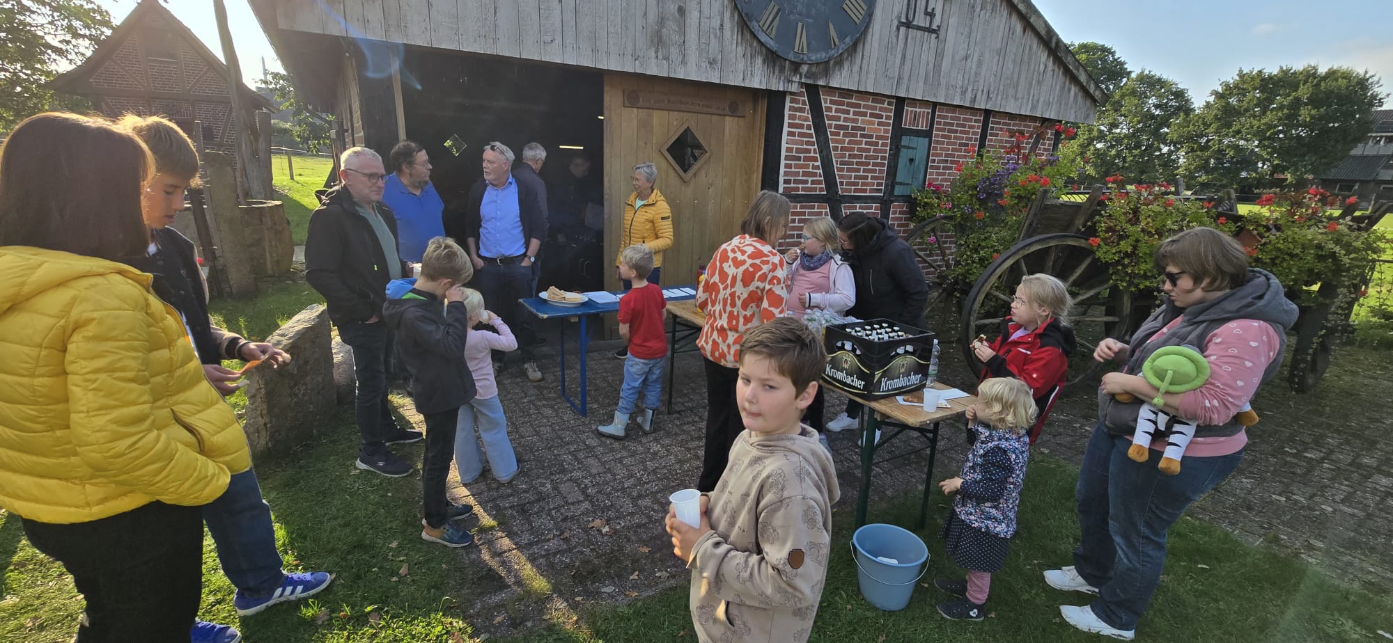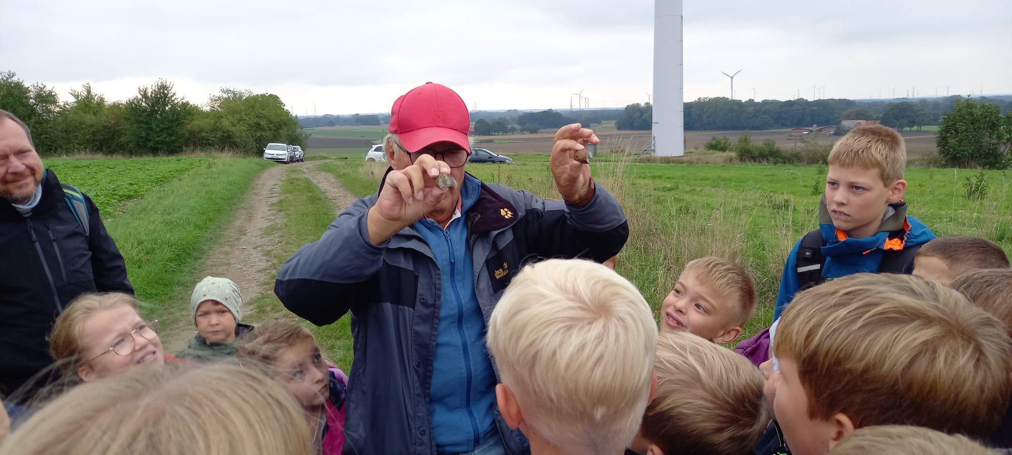 Am letzten Samstag im September begab sich Heimatkundler Heinz Koops mit rund 25 Kindern im Grundschulalter auf Entdeckertour am Dörper Berg – einer wahren Fundgrunde für Fossiliensammler. Ausgerüstet mit Hammer, Sammelbehälter und festem Schuhwerk ging es zunächst mit den Autos der Vorstandsmitglieder Richtung Offlum. Nach einer kurzen Einführung durch Heinz Koops, der den Kindern die wichtigsten Regeln für die Fossiliensuche erklärte, machten sich die kleinen Forscher auf die Suche nach versteinerten Relikten von Urzeitwesen, den einzigartigen Zeugen einer ferner Vergangenheit. Geformt wurden diese vor allem von mehreren Vereisungen, die vor einigen Millionen Jahren ihren Anfang nahmen. Damals kühlte die Erde ab, das Eiszeitalter begann und in den hohen Breiten schmolz der Schnee nicht so schnell wie neuer fiel. Gewaltige Eisschichten entstanden und schoben sich fortan südwärts. Mit viel Geduld, Ausdauer und etwas Glück machten die Kinder an diesem Nachmittag spannende Entdeckungen und erforschten die Welt der Versteinerungen. Am Ende dieses lehrreichen Abenteuersstärkten sich die neuen Hobby-Paläontologen nochmal mit Bratwurst und Getränken am Heimathaus und durften als Belohnung für ihre „Sammelleidenschaft“ noch eine Tüte Süßes mit nach Hause nehmen.