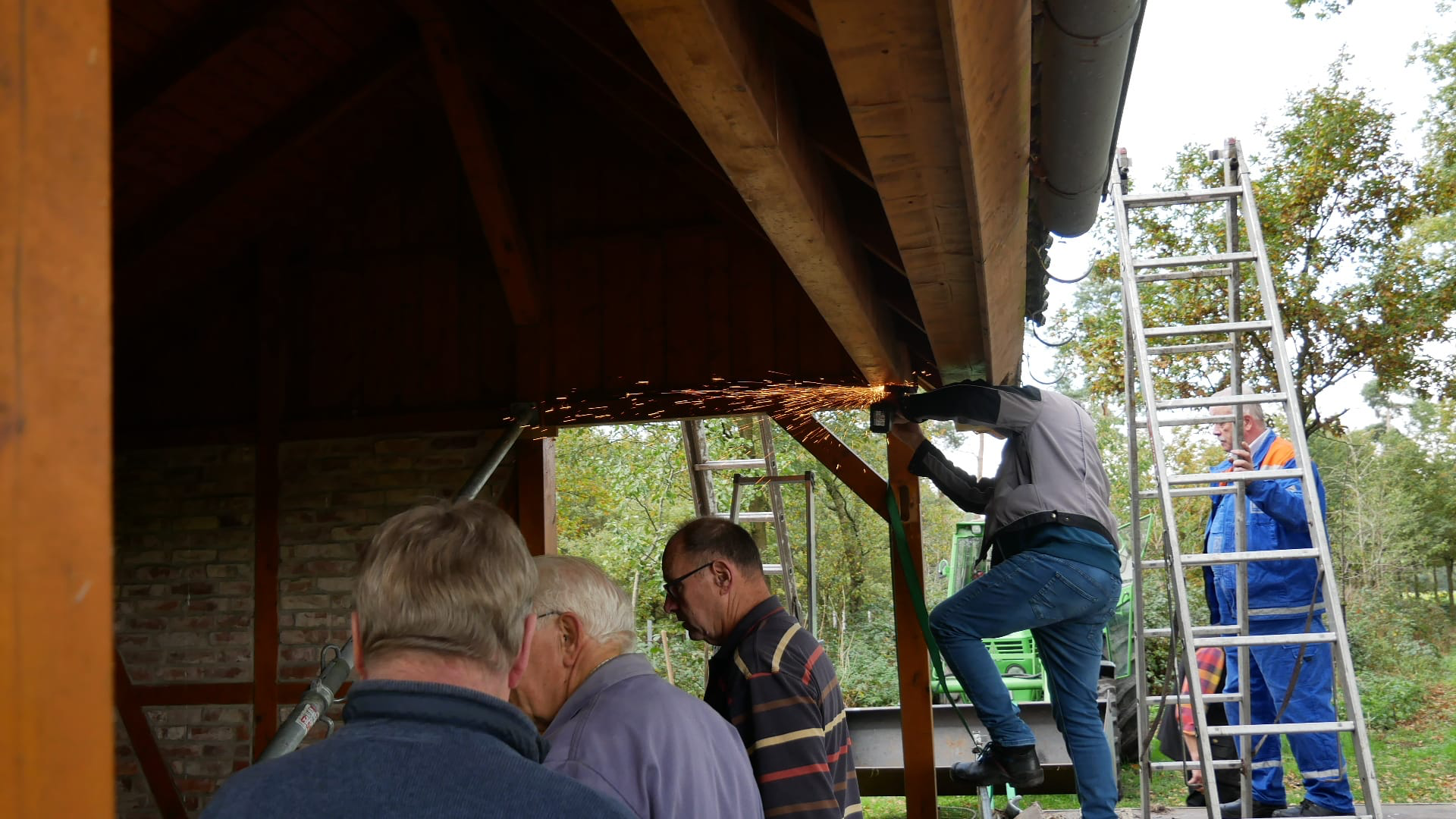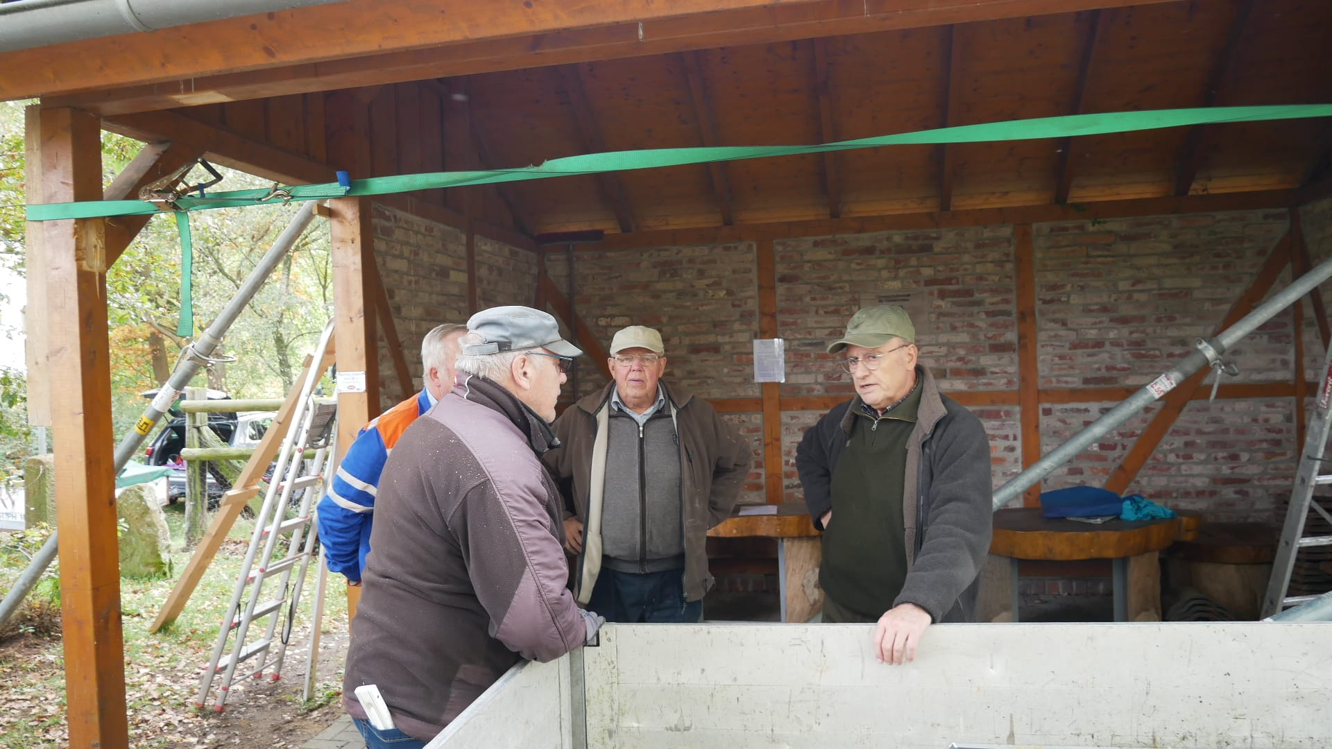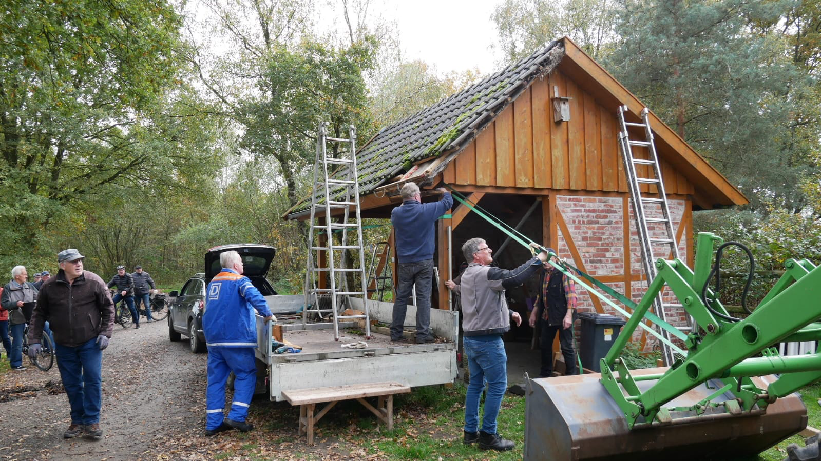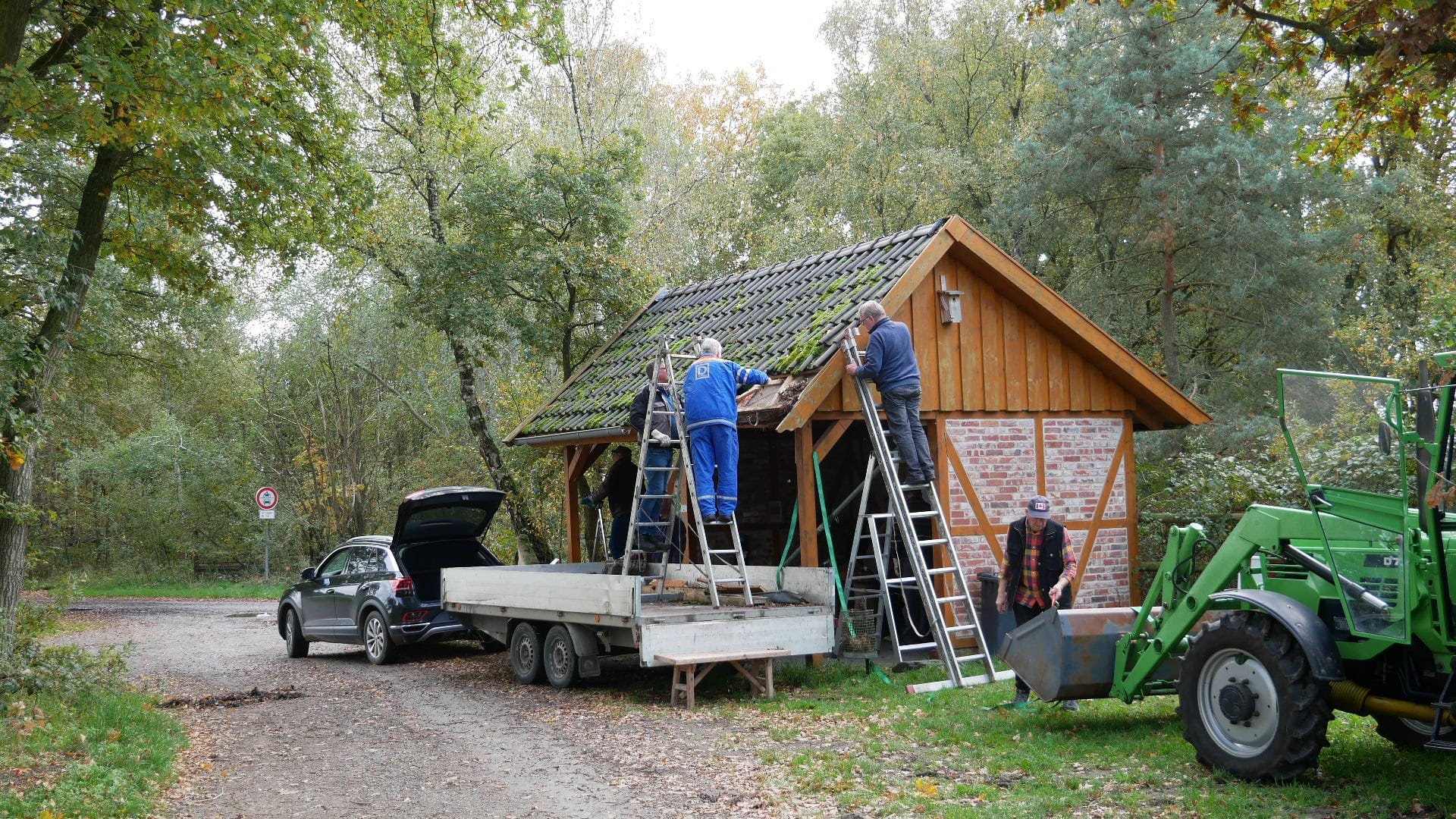Doch anstatt aufzugeben, beschlossen die Heimatvereine, die Ärmel hochzukrempeln. Am 22. Oktober 2025 versammelte sich eine kleine, aber entschlossene Gruppe von Ehrenamtlichen: Hans Knöpker und seine Kollegen aus Steinfurt und Borghorst sowie Herbert Volkert, Hubertus Holtgräwe, Hubert Gude, Karl Stegemann und Gerd von der Haar. Mit großem Elan und technischem Sachverstand machten sie sich an die umfangreichen Reparaturarbeiten. Bemerkenswert: Einige von ihnen waren bereits vor neun Jahren an der ursprünglichen Planung und Errichtung der Hütte beteiligt gewesen und brachten somit das perfekte Know-how mit.