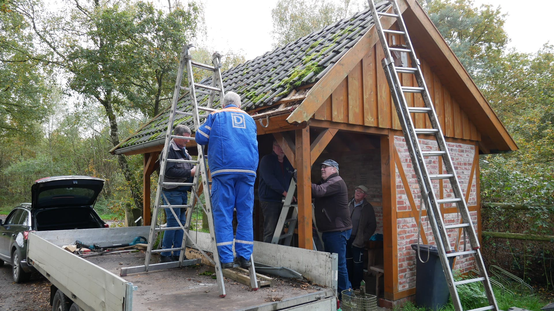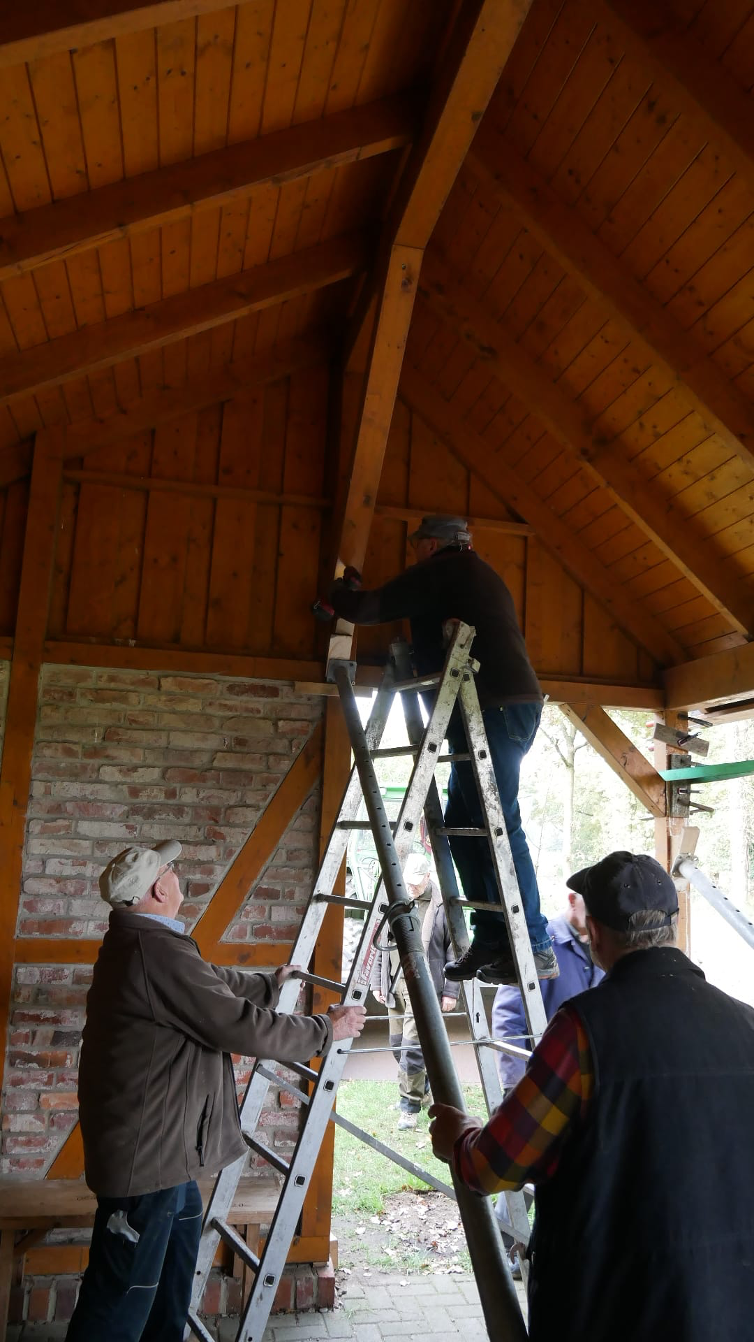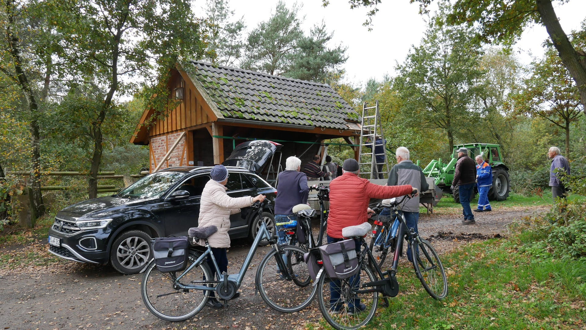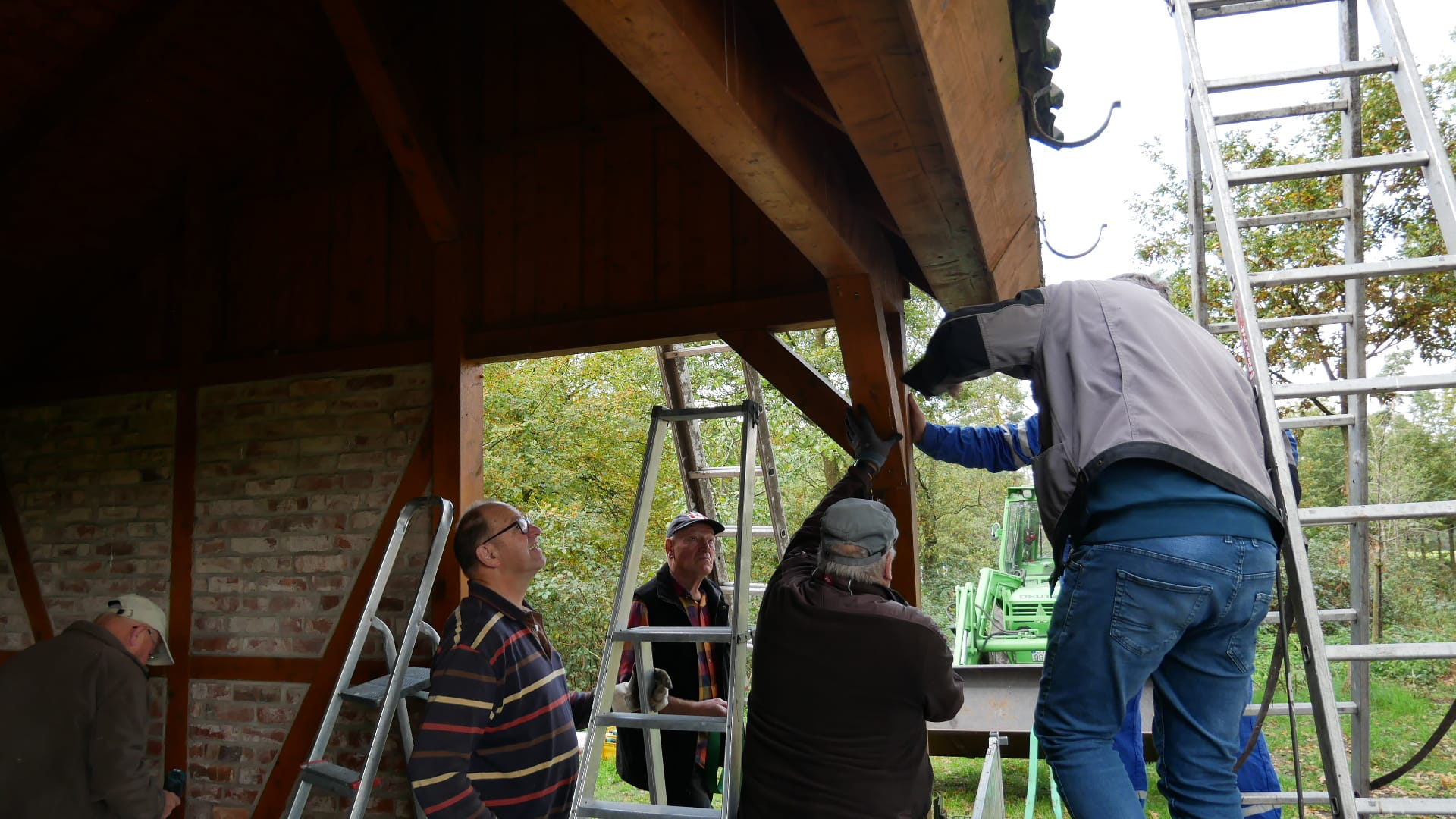 Doch anstatt aufzugeben, beschlossen die Heimatvereine, die Ärmel hochzukrempeln. Am 22. Oktober 2025 versammelte sich eine kleine, aber entschlossene Gruppe von Ehrenamtlichen: Hans Knöpker und seine Kollegen aus Steinfurt und Borghorst sowie Herbert Volkert, Hubertus Holtgräwe, Hubert Gude, Karl Stegemann und Gerd von der Haar. Mit großem Elan und technischem Sachverstand machten sie sich an die umfangreichen Reparaturarbeiten. Bemerkenswert: Einige von ihnen waren bereits vor neun Jahren an der ursprünglichen Planung und Errichtung der Hütte beteiligt gewesen und brachten somit das perfekte Know-how mit.